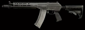 | AK-102 | ![]() | 5,56 x 45 mm OTAN | Semi‑autoAutomatique | 600 | Version d’exportation courte d’un fusil d’assaut Kalashnikov chambrée en 5,56 mm, équipée d’une crosse rabattable sur le côté et d’un montage latéral pour lunettes de visée et de vision nocturne. |