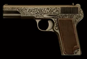| TT-33 (doré) | ![]() | 7,62 x 25 mm Tokarev | Semi-auto | 30 | Un pistolet légendaire. Il a connu de nombreux conflits armés et est encore en service dans certains endroits du monde, dans une version ou une autre. Celui-ci est un TT-33 classique, la version la plus produite. Il dispose d’un système de canon pivotant à recul court Browning. Délibérément simple, à simple action, ne comporte aucun cran de sûreté, excepté un arrêtoir en position intermédiaire du chien, il est capable de résister aux abus les plus invraisemblables. Grâce aux puissantes cartouches de 7,62 x 25 et à un canon plutôt long, le TT tire à une vitesse initiale élevée, avec un pouvoir de pénétration et une précision impressionnante, même à longues distances. Édition spéciale dorée. |